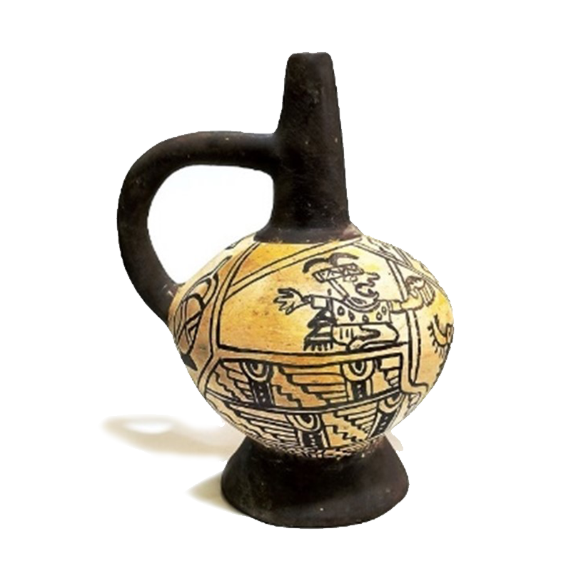 La botella tiene un cuerpo globular con una base ancha y estable, facilitando su colocación. En la parte superior, se destaca un pico alargado que sirve como vertedero, acompañado de un asa arqueada que conecta el cuello de la botella con la parte superior del cuerpo, proporcionando un agarre seguro.